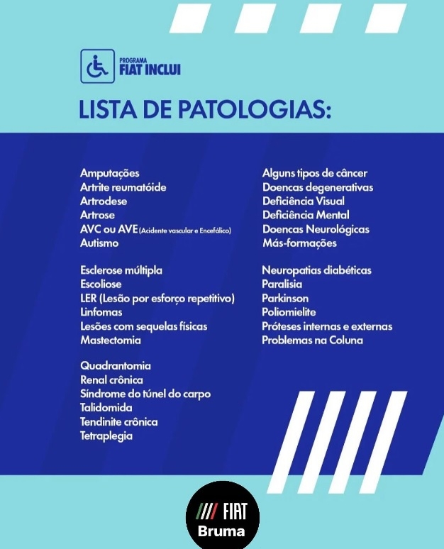 Veja acima as doenças/traumas/sintomas que um portador de necessidade pode possuir na hora de comprar o seu veículo 0km em uma concessionária FIAT.