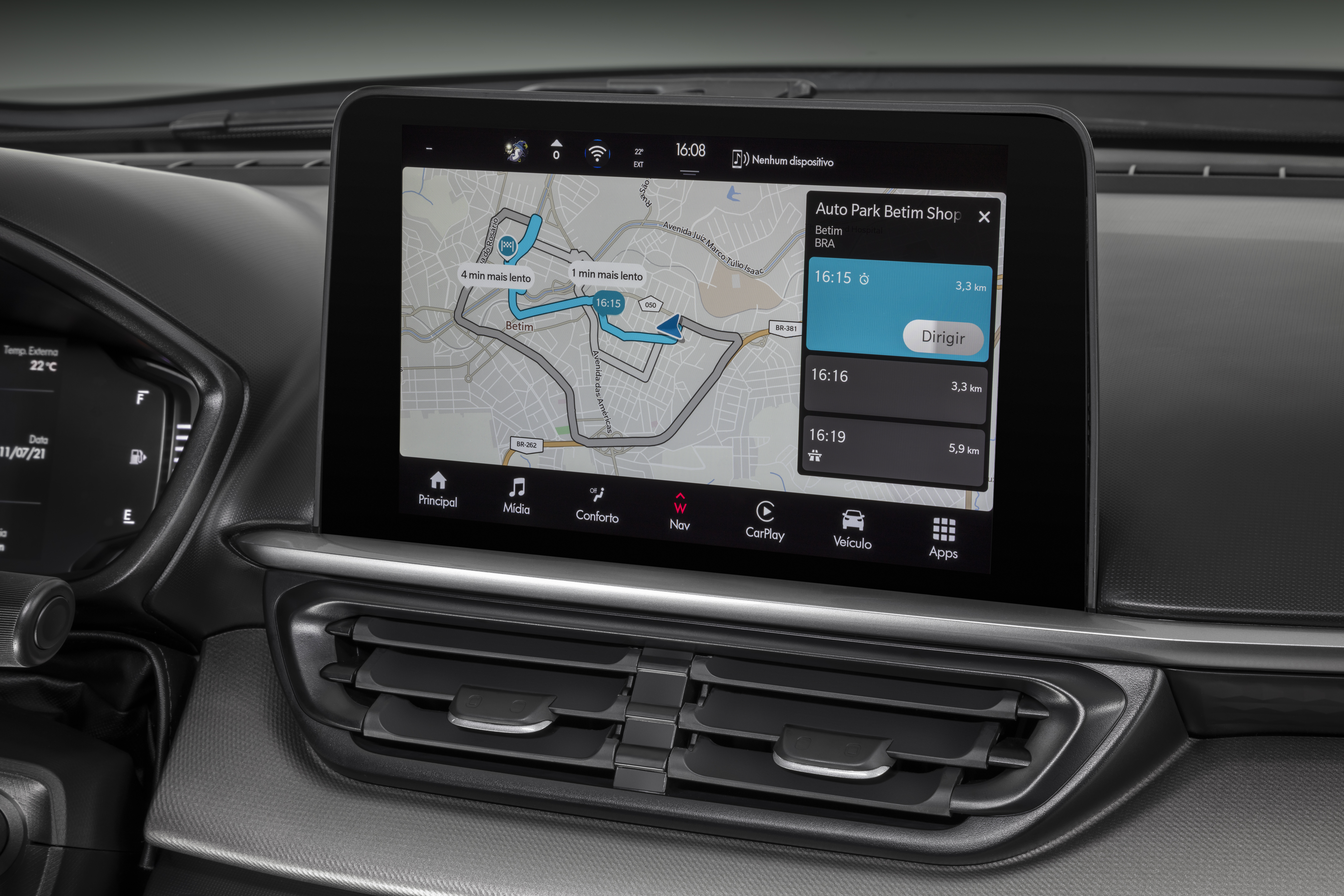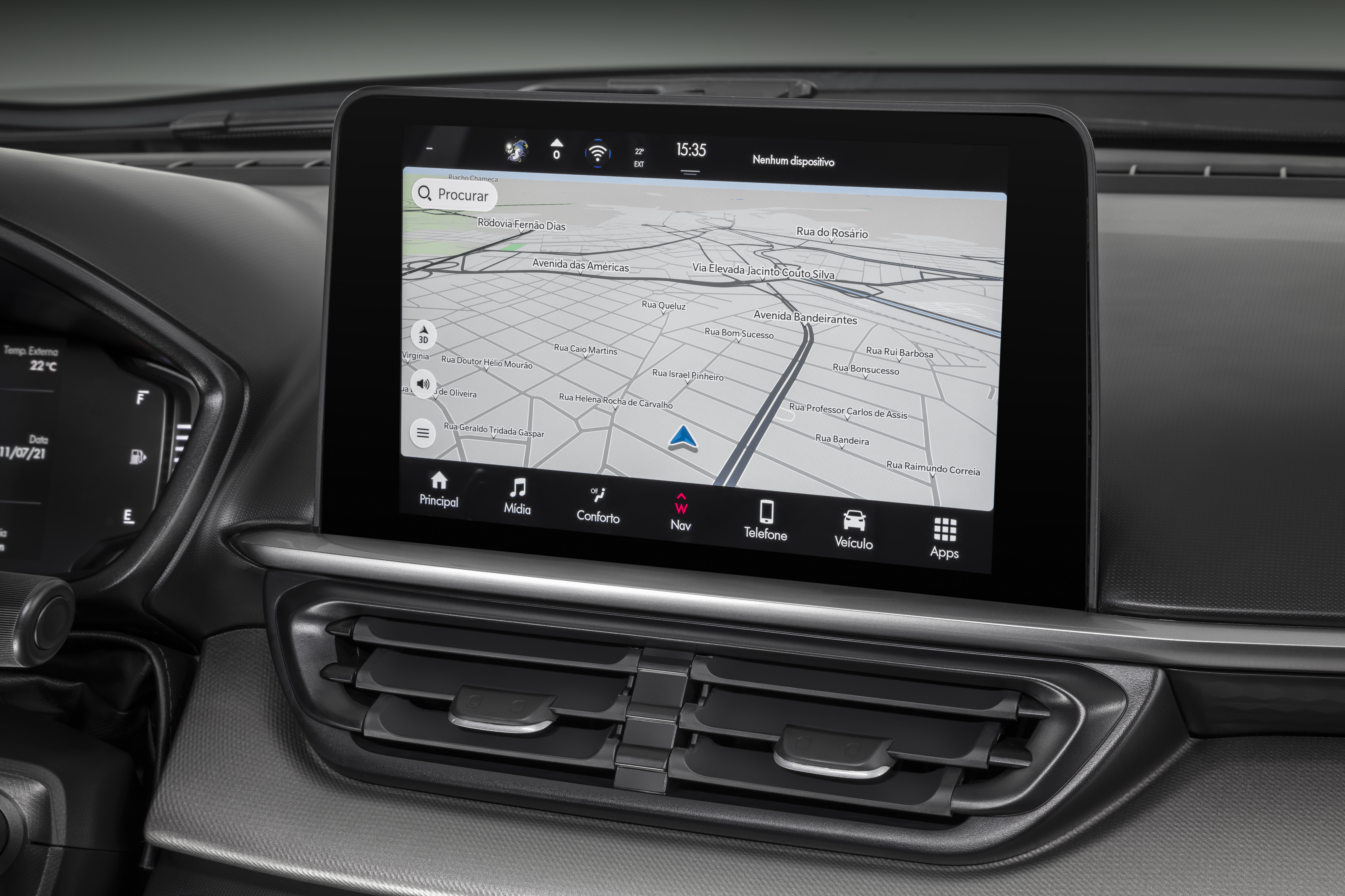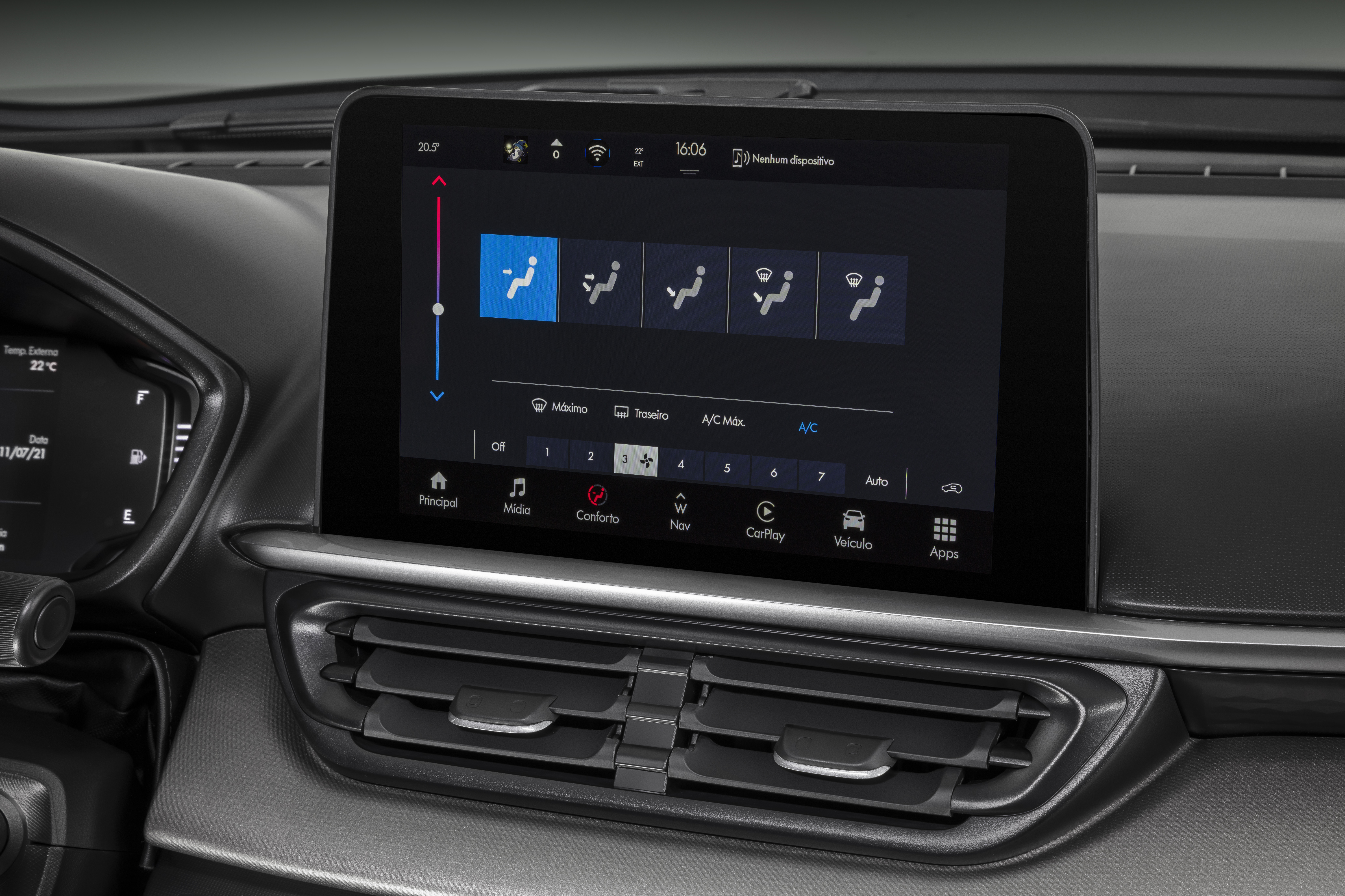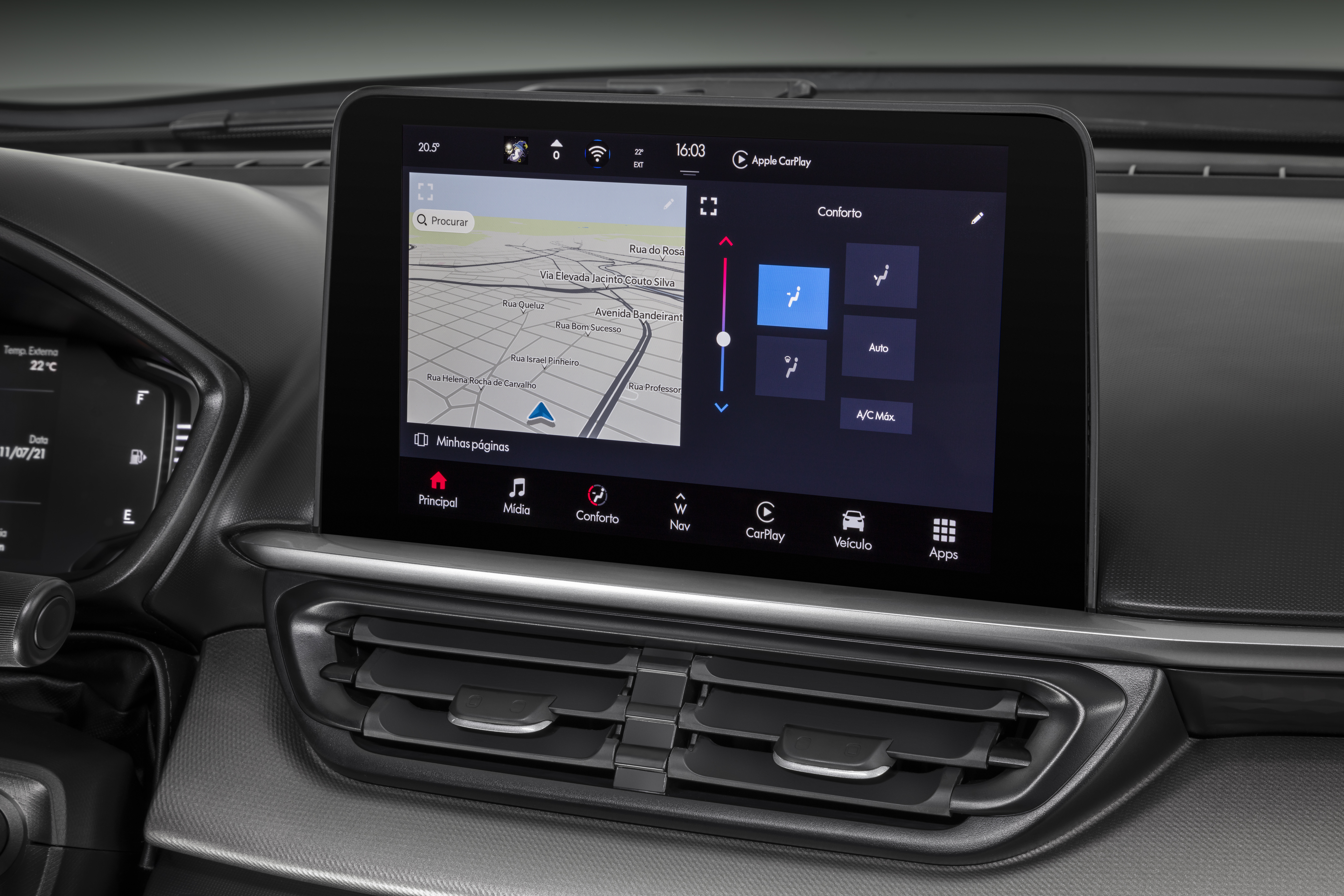 Não poderia ficar de fora a central multimídia flutuante de 10,1” na horizontal com navegação nativa e mapa em 3D, em posição voltada ao motorista, outro equipamento de última geração que permite, entre outros recursos, controlar o ar-condicionado automático digital. E também o Wireless charger, no qual basta ao cliente posicionar seu smartphone na área específica do console para iniciar o carregamento sem fio de seu aparelho.